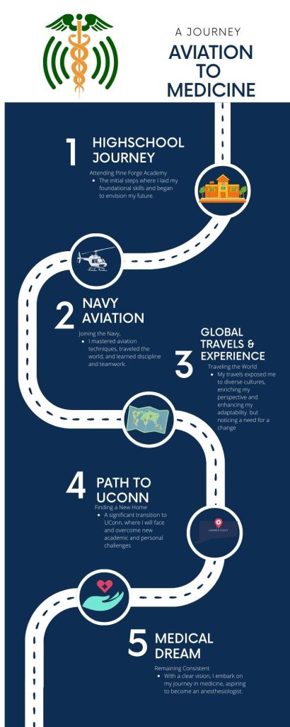Working as an aviation Technician and traveling the world with the Navy shaped the person I am today; however, I am still growing. Experiencing different cultures and acquiring different skills gave me the mindset to achieve my goals. The lack of satisfaction motivated me to make a change to strive for my goals while changing the lifestyle I am accustomed to, the Navy. Though it was difficult, From relocating to relearning and adjusting to challenges, finding my way into the Institution of UConn helped me to further my options. Through pursuing higher education, I plan to become an anesthesiologist. Though I realize it is a long road. Guided by motivation and sustained by patience, the process of reaching my goals will be a rewarding experience.